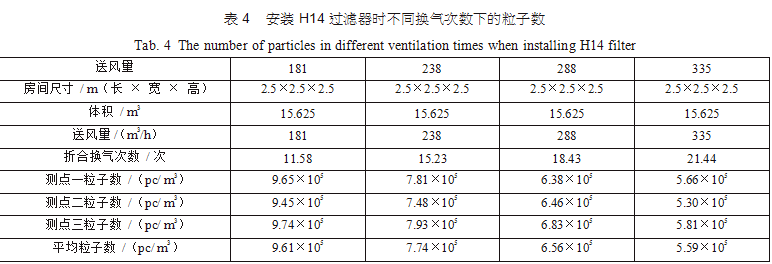 在空調(diào)機(jī)房中新建了三間2.5m×2.5m×2.5m的潔凈間,從空調(diào)主風(fēng)管引風(fēng),每支支管設(shè)置調(diào)節(jié) 閥,并設(shè)排風(fēng)機(jī)進(jìn)行全排,送回風(fēng)口及測點(diǎn)布置分別如圖 3(每點(diǎn)取樣三次,取平均值)??紤]到初中效過濾器對最后潔凈度的影響和最后理論塵埃數(shù)量 計算的方便,試驗用初中效繼續(xù)分別為G4、F8,三個房間分別安裝高效過濾器,風(fēng)量500m3/h,第一組數(shù)據(jù)為送風(fēng)量按GMP 驗證指南推薦換氣次數(shù)保持不變,分別用H12、H13、H14、U15過濾器,第二組數(shù)據(jù)為采用H13高效過濾器,調(diào)節(jié)風(fēng)量 ;第三組數(shù)據(jù)為采用H14高效過濾器,調(diào)節(jié)風(fēng)量,分別測得塵埃粒子數(shù),并列表得出不同的換氣次數(shù)下對應(yīng)的塵埃數(shù)如表2、表3、表4。